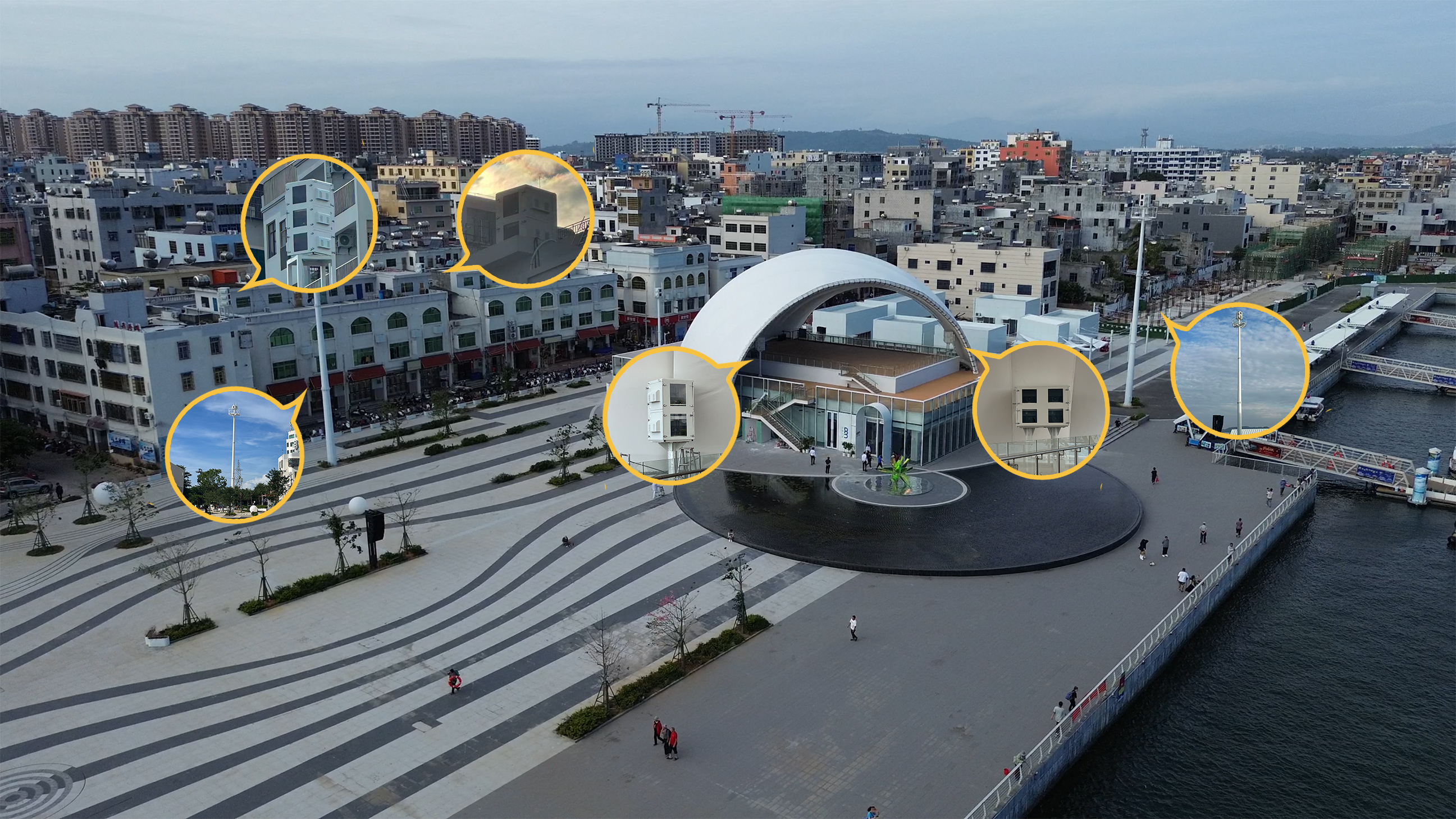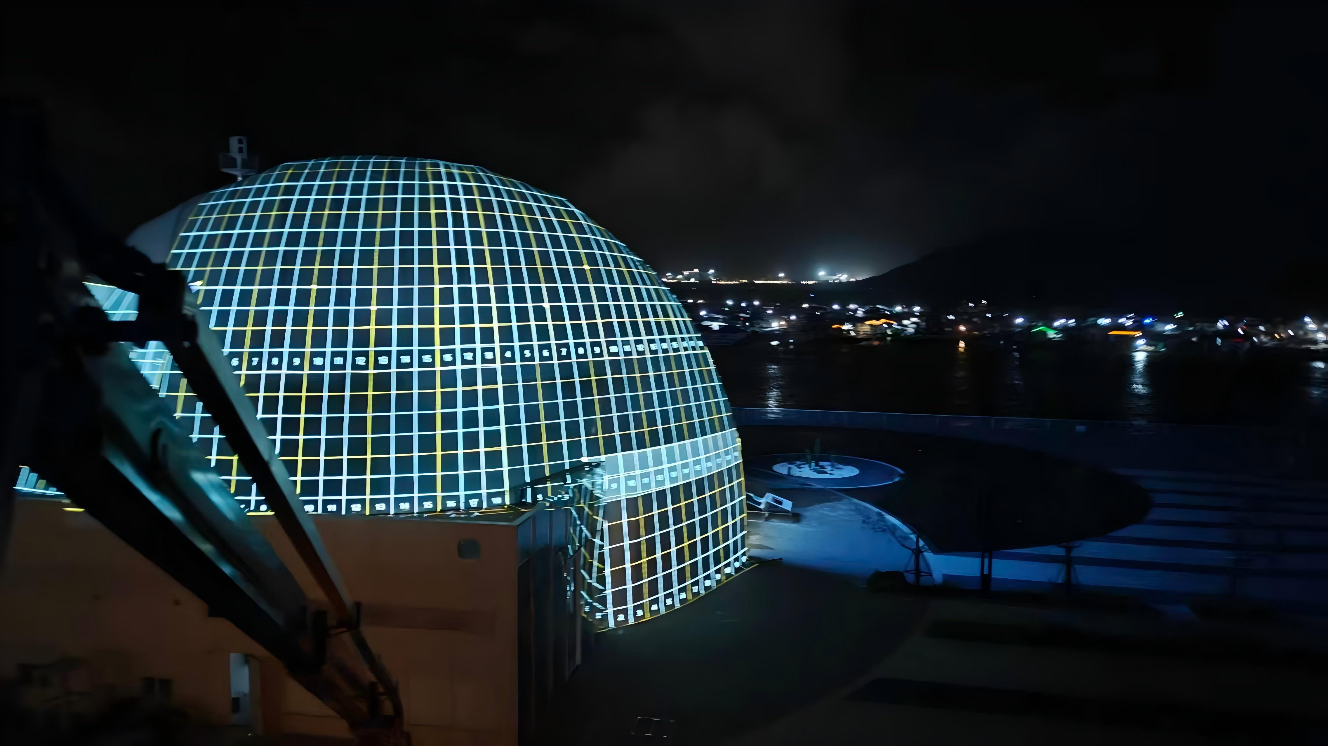 面对38米直径的内外双球幕投影,传统方案已不再适用,视美乐创新定制天际环绕全维度投影布局,突破投影机传统范围、高度限制进行多点安装,通过结构优化和材质升级,将不可能变为可能,即使是在海边24米这种严苛高空环境下,也能以完美的施工专业度实现球幕光影的完整链接覆盖。