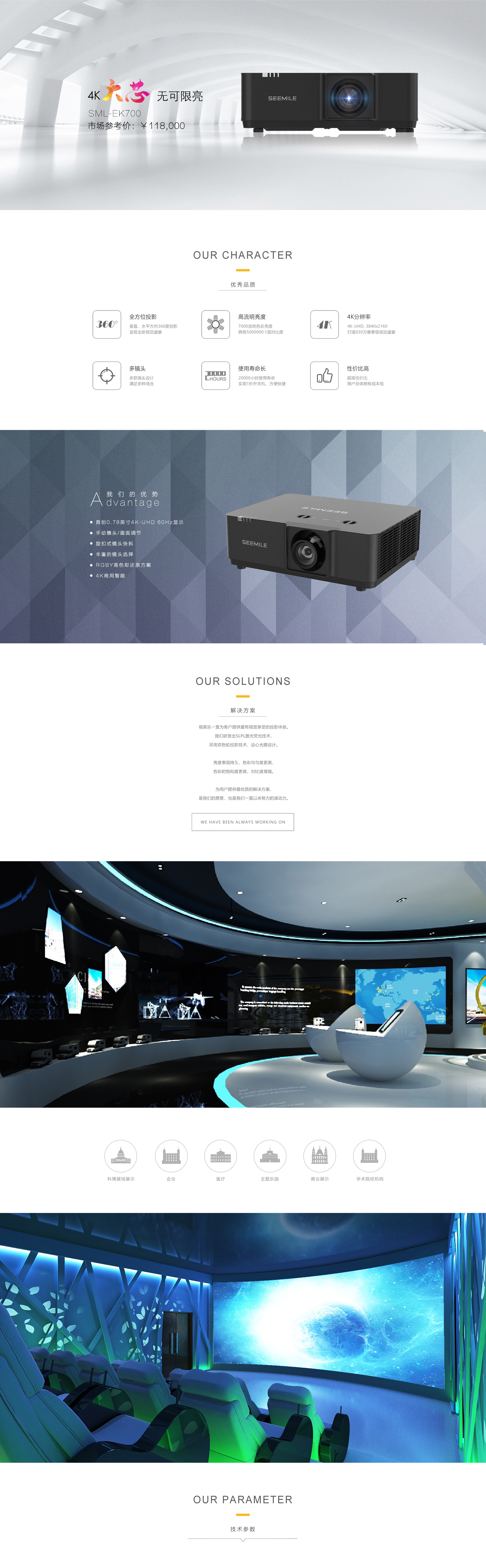 产品线:工程投影机;产品系列:E系列;技术:0.78英寸DLP;重量:<10KG;亮度:7000流明;分辨率:4k(3840x2160);应用场景:文旅文创,异形投影,虚拟仿真,会议显示,教育,展览展...